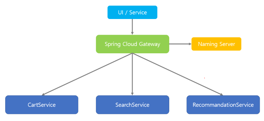외부 또는 내부의 서비스에서 오는 요청이 스프링 클라우드 게이트웨이를 통해서 원하는 서비스를 찾아갈 수 있게 된다. 여기서 naming server는 찾고자 하는 서비스의 위치를 저장하고 있다.